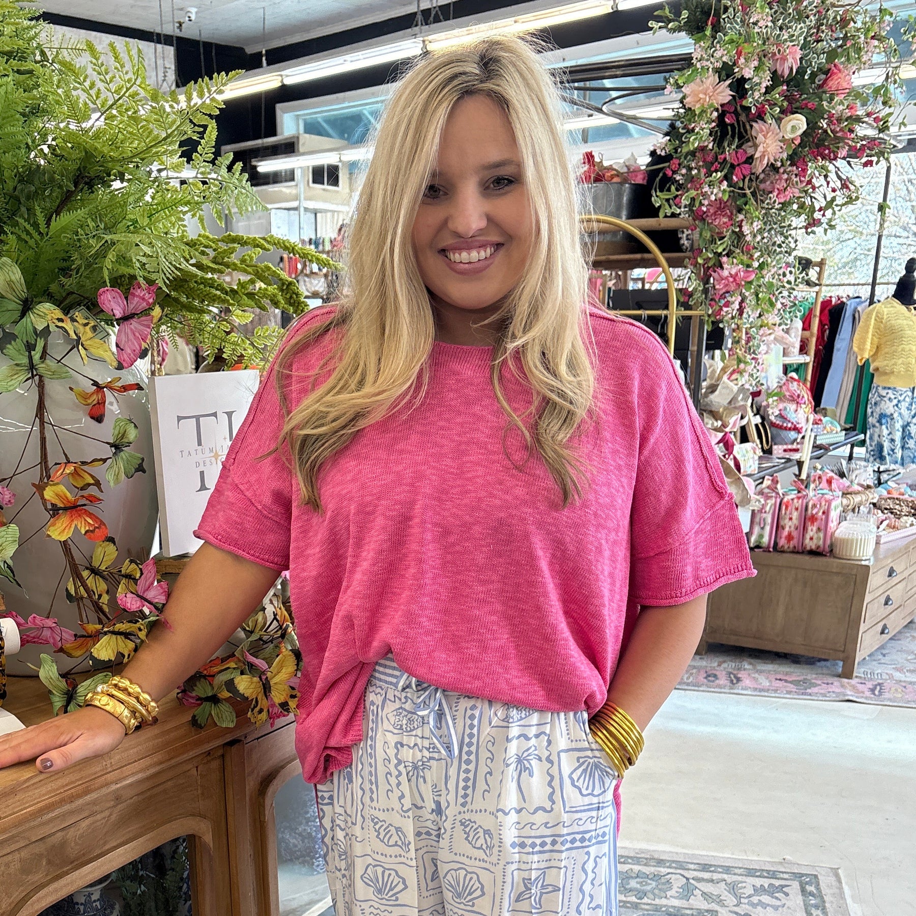 This stylish top is crafted from a luxurious blend of cotton slub and viscose knit, offering a perfect combination of comfort and elegance. Designed with a versatile one-size-fits-most boxy fit, it effortlessly flatters a variety of body types. The short sleeves provide a relaxed and casual look, while the swing hem adds a touch of playful movement to your outfit. Measuring approximately 27 1/2 inches from shoulder to hem, this top offers a flattering length that pairs beautifully with both jeans and skirts. Made from 60% cotton and 40% rayon, it ensures breathability and a soft touch against the skin, making it an ideal choice for any season. Whether you're dressing up for a day out or keeping it casual, this top is a must-have addition to your wardrobe.